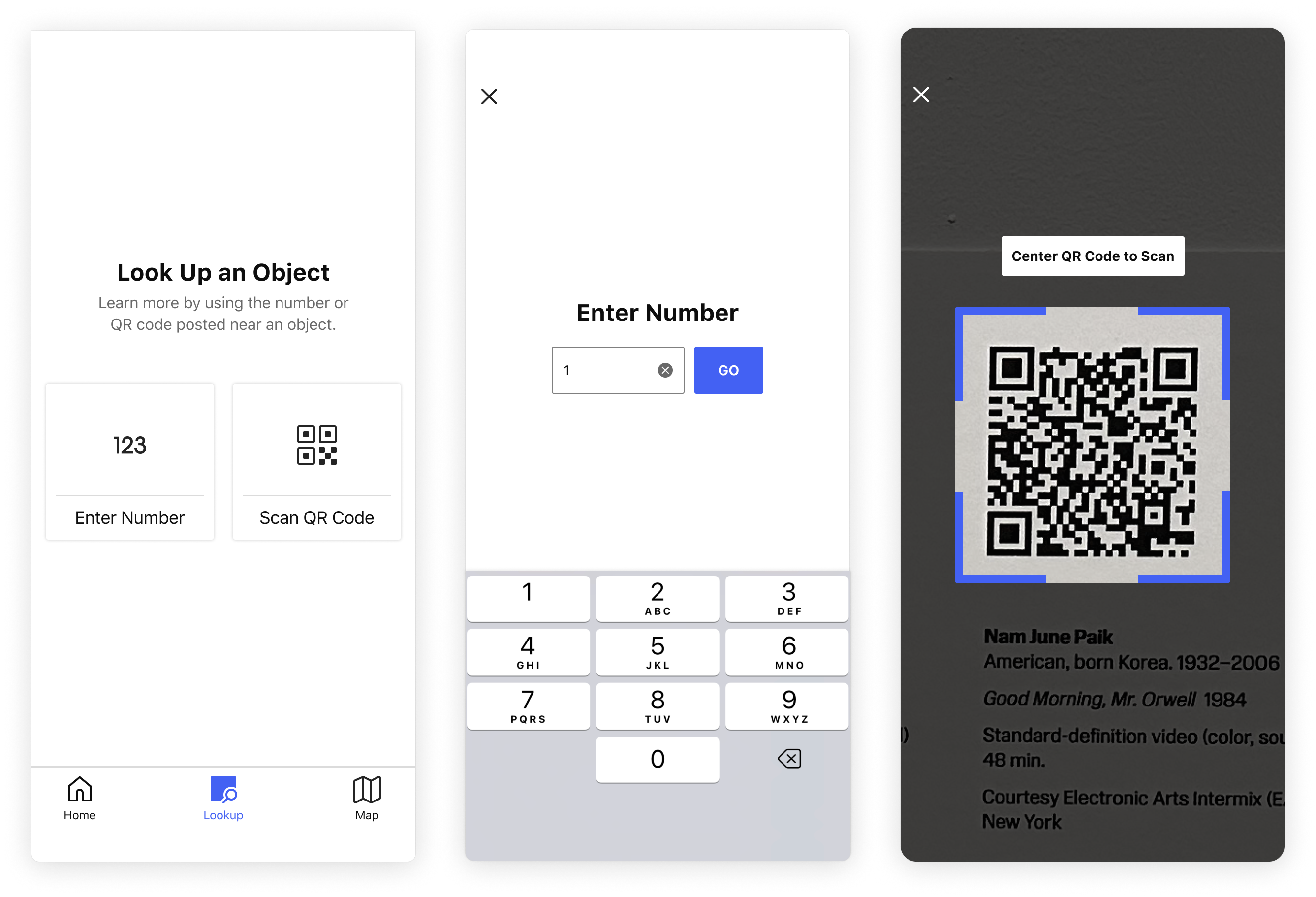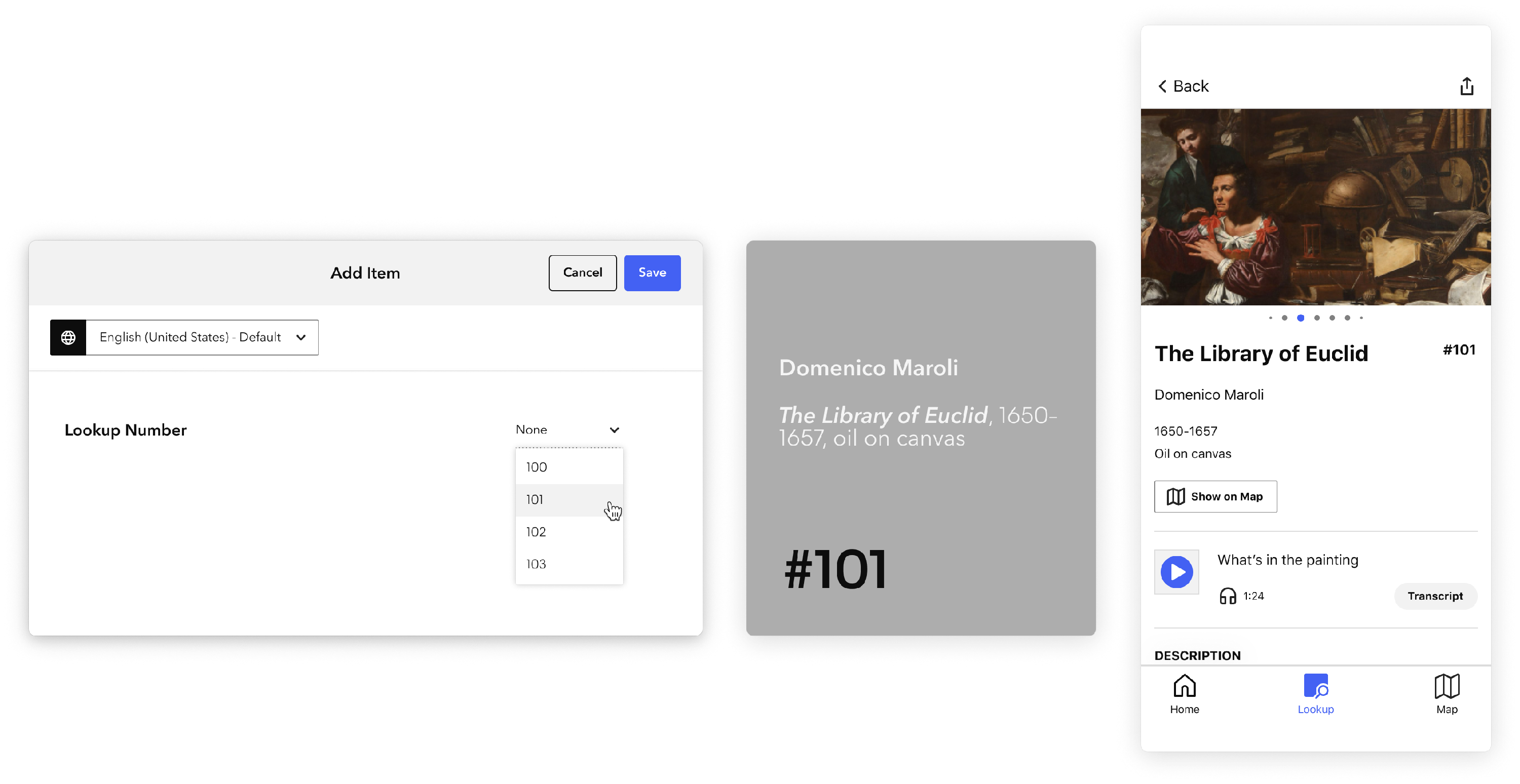 Lookup numbers and QR codes connect the physical and digital worlds. They help visitors make the connection between what they see in your physical space (e.g., a painting on your wall) and the content available in your guide (e.g., an Item that includes audio from the artist explaining their process).