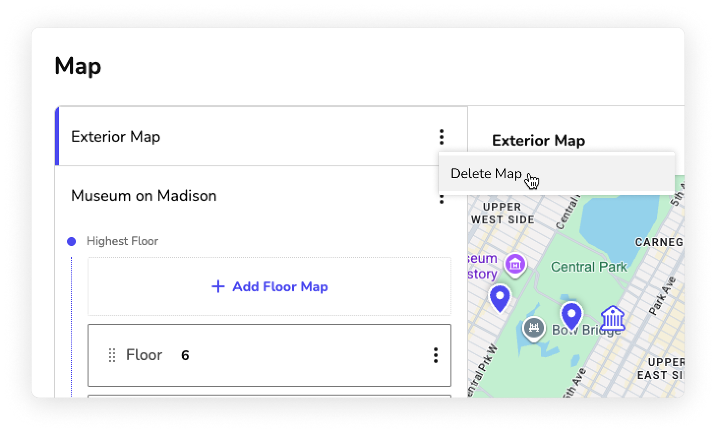 In the Guide section, on the Map page, click the more actions menu (⫶) next to the exterior map name, then select Delete Map.