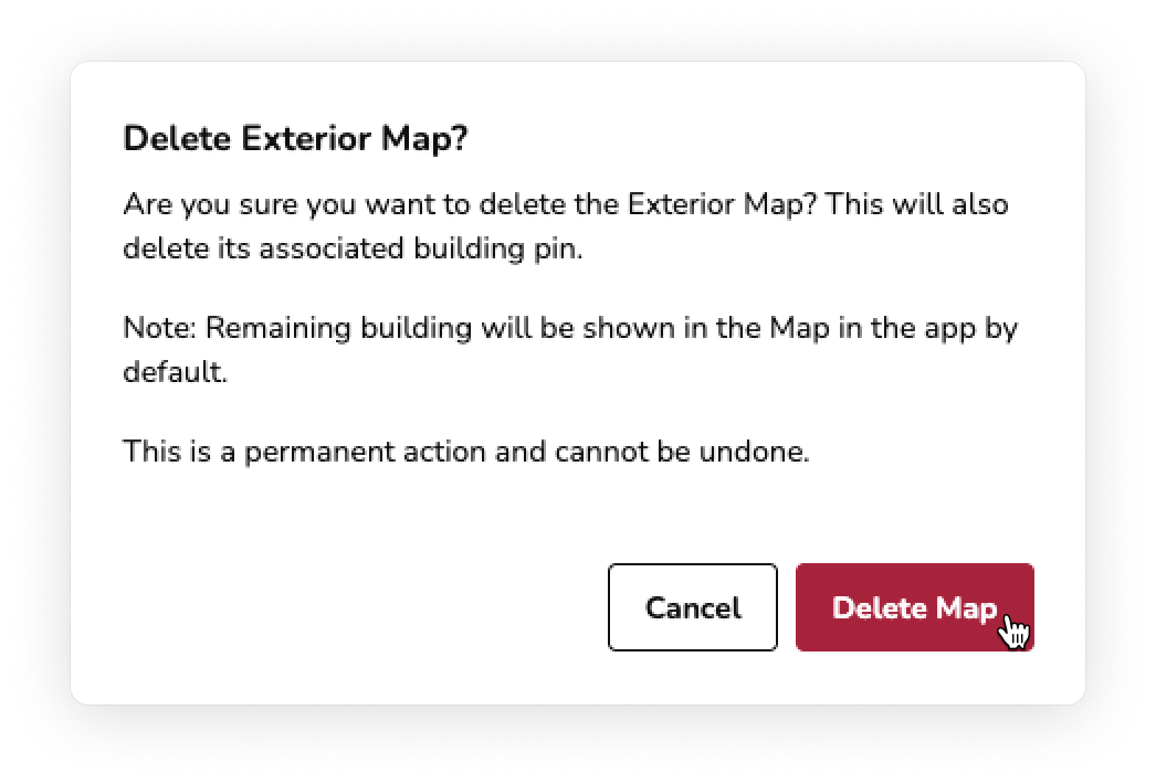 When you delete the exterior map, the building pin is deleted but the building (and any associated floorplans) remains.