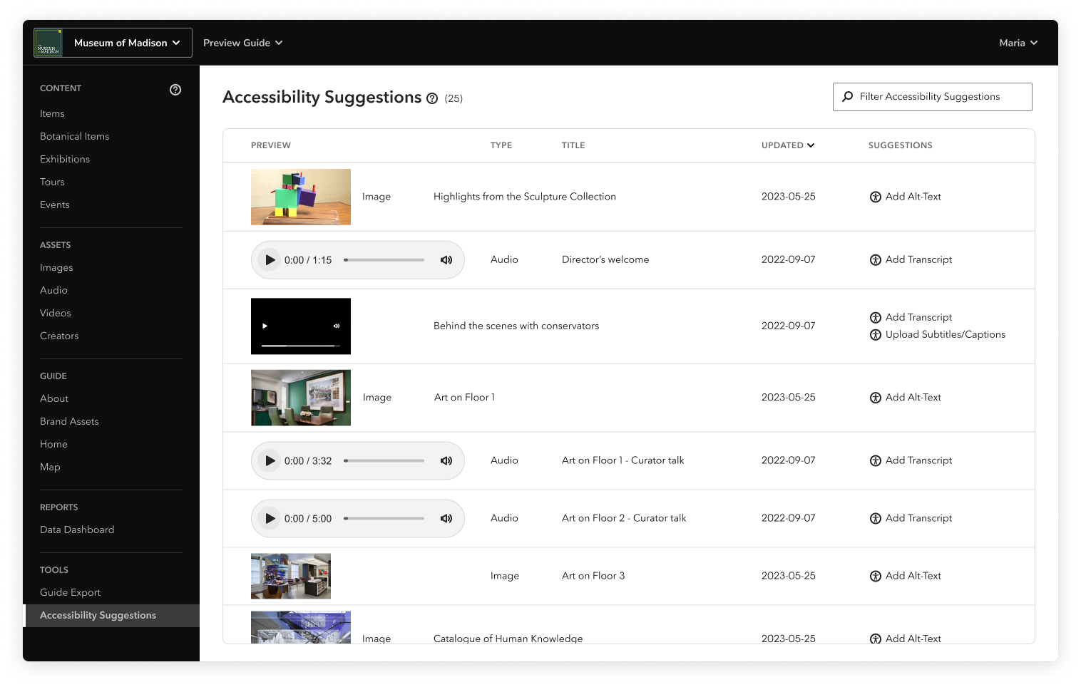 The Accessibility Suggestions dashboard can help you build a strategy around accessible content and create a guide that can be enjoyed by all. For complete details on how Bloomberg Connects strives to be a strong partner in expanding access, see our Accessibility statement.