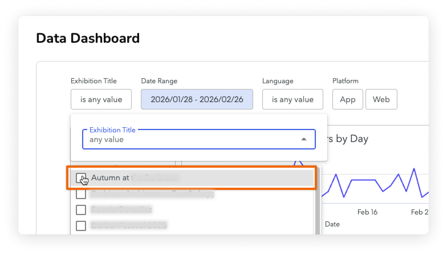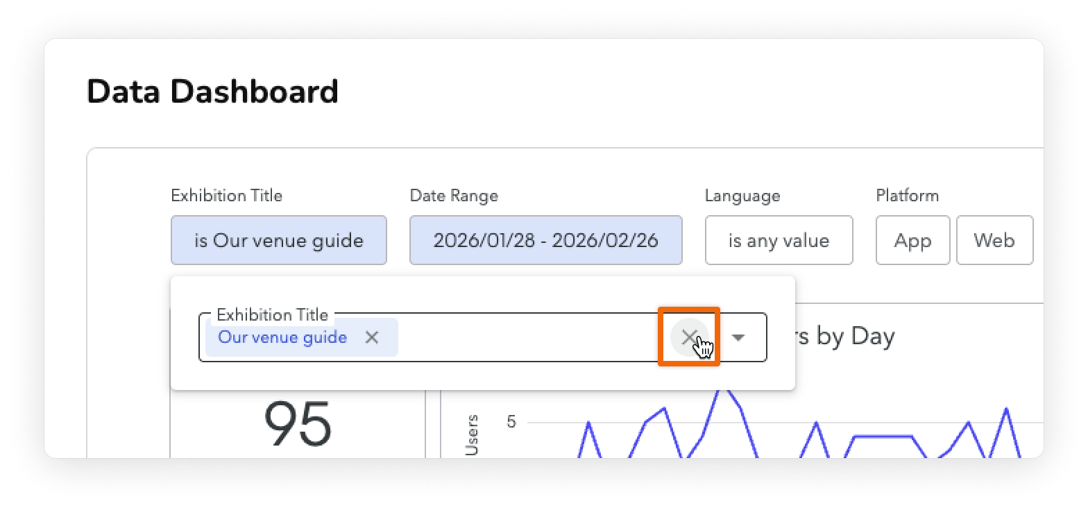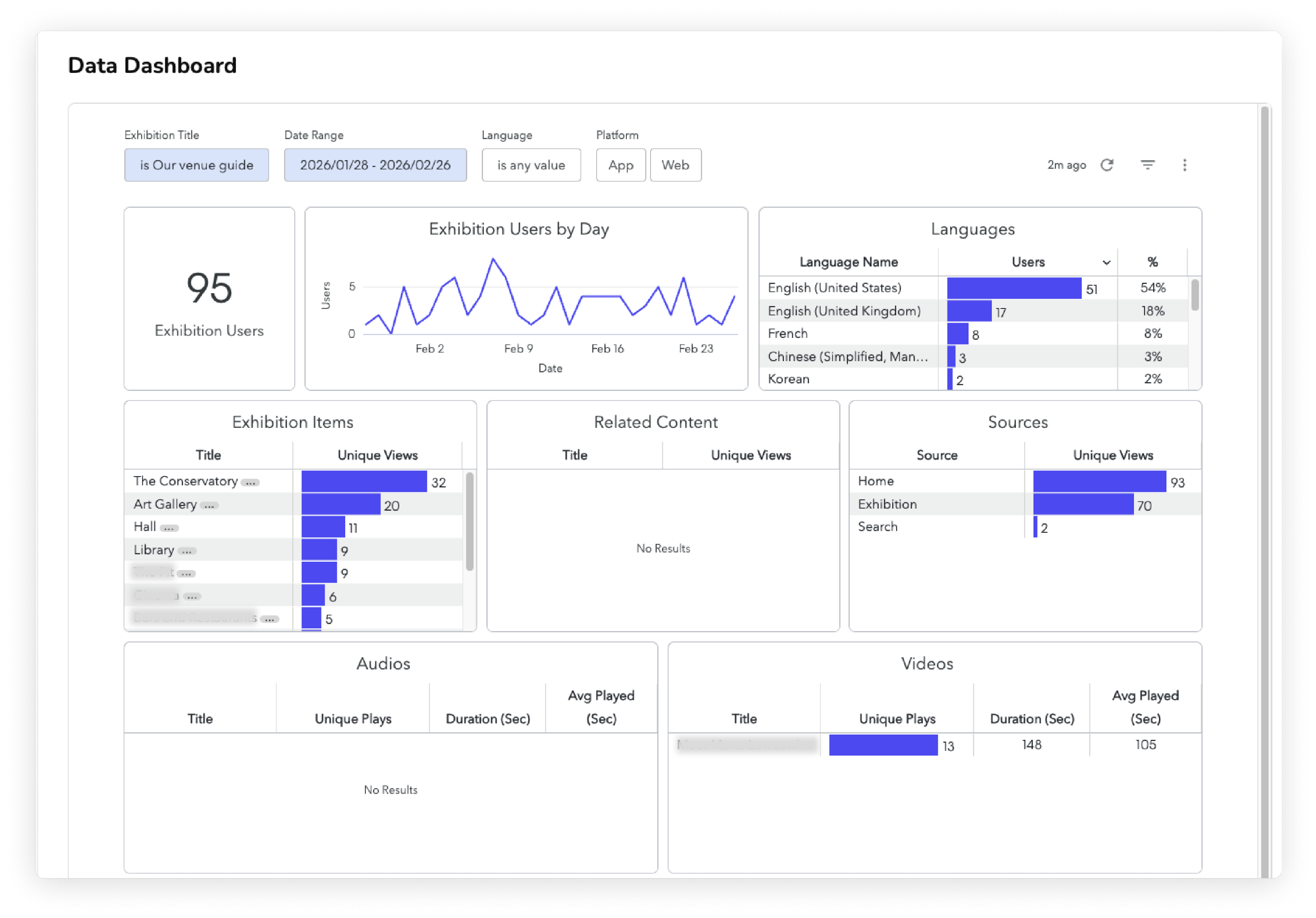The detail pages of your dashboard show you how people interacted with a specific piece of content in your guide. For example, you can open the detail page for a specific Exhibition to see which of the Exhibition's Items had the most unique views.