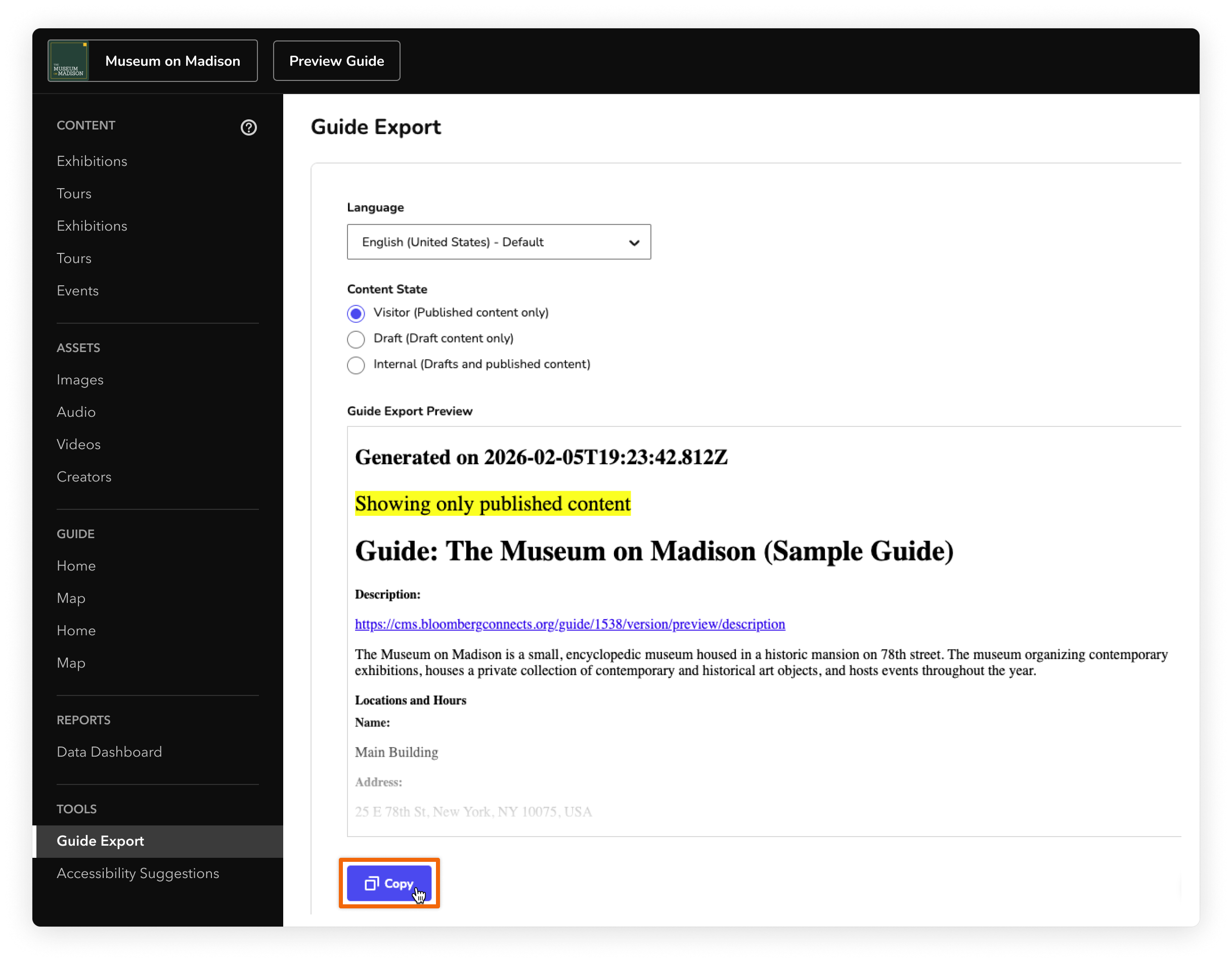 In the Tools section, on the Guide Export screen, preview the text version of your guide, then click Copy to add the content to your clipboard.