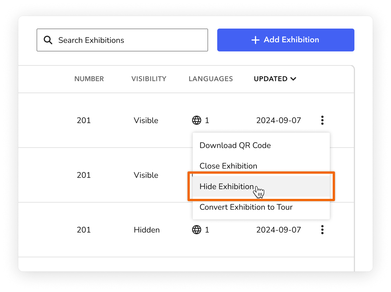 To hide content (e.g., an Exhibition), on the content grid, click the more actions menu (⫶) and select the "hide" option (e.g., Hide Exhibition).