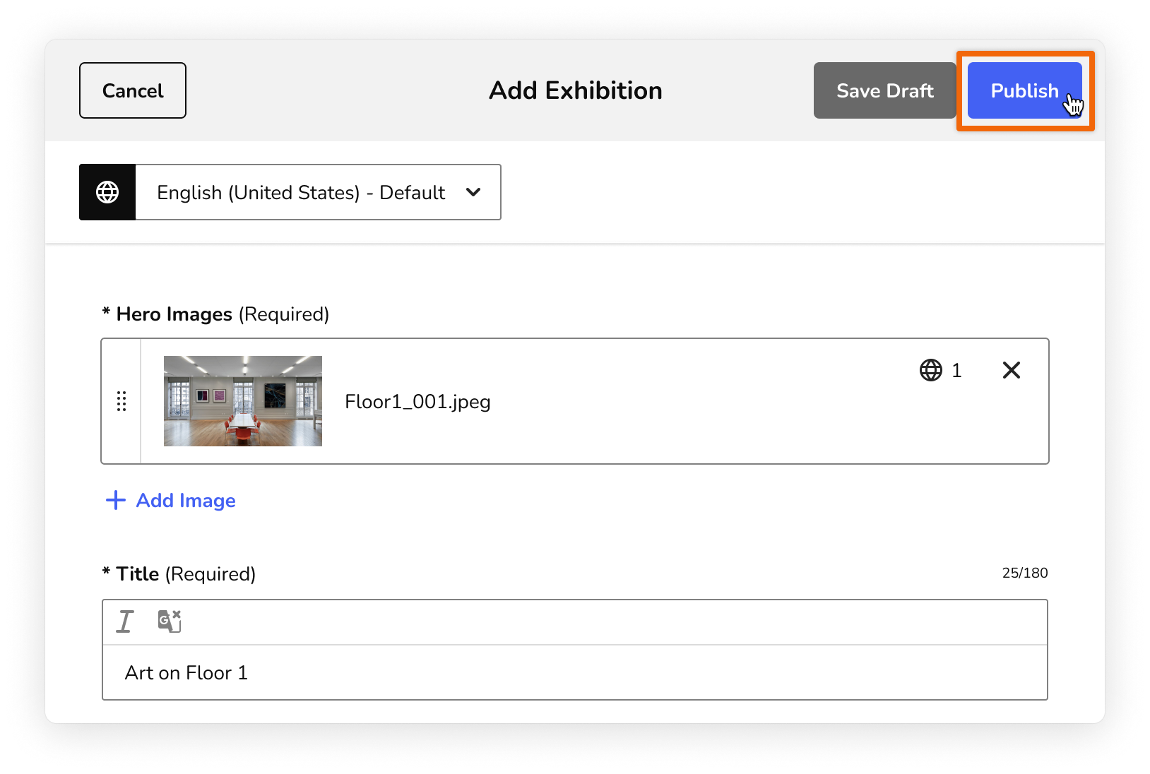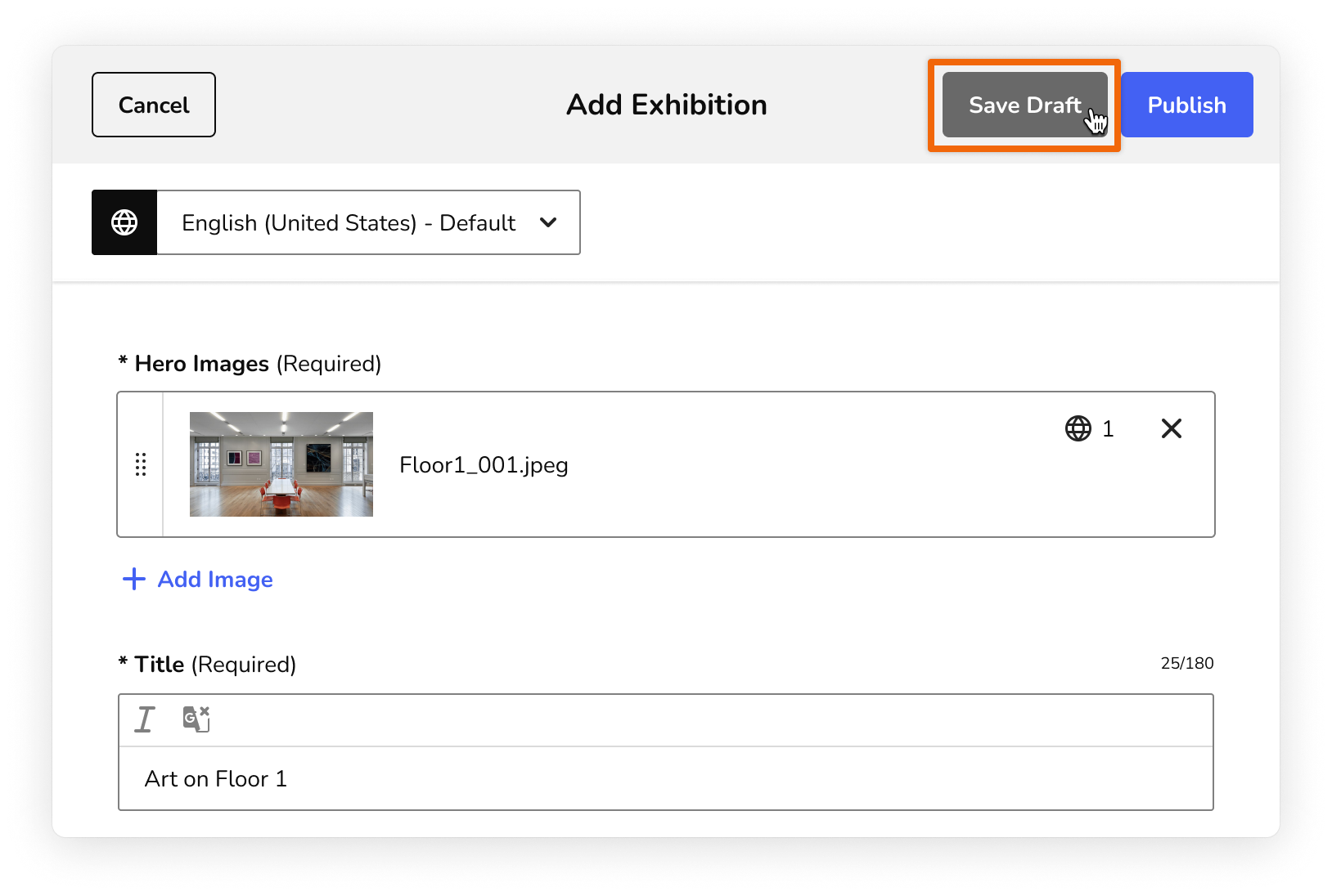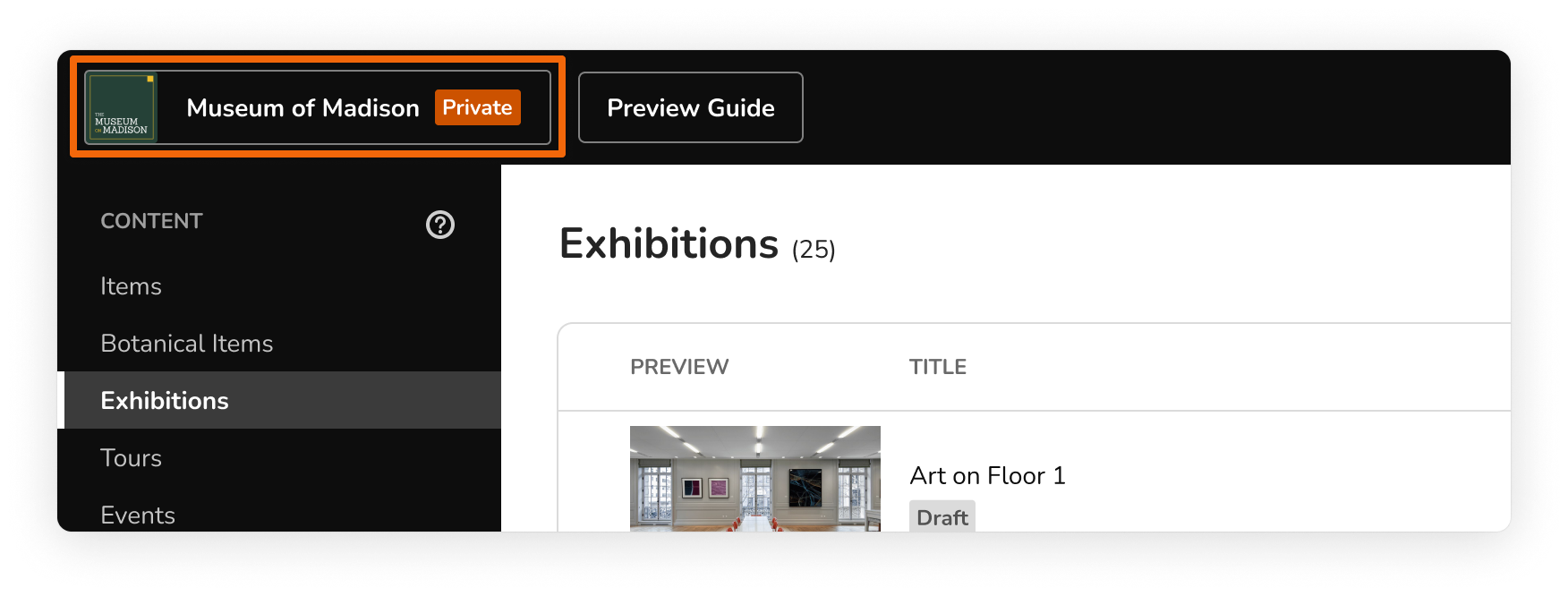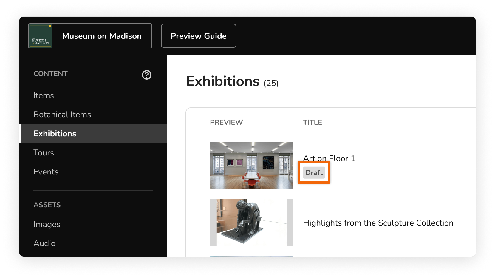 Each piece of content in your guide—Items, Exhibitions, Tours, and Events—exists in one of two states: draft or published.