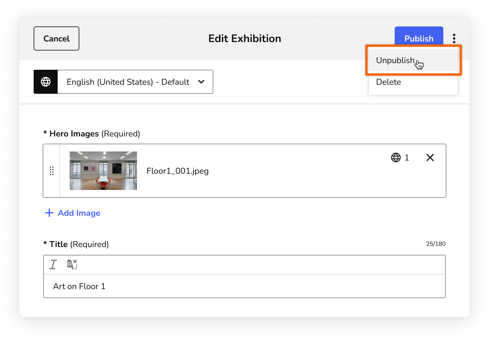 - On the content form for Tours, Exhibitions, and Events, you can choose whether the content should be automatically unpublished at the end of the display period. For more, see Automatically unpublish old content.