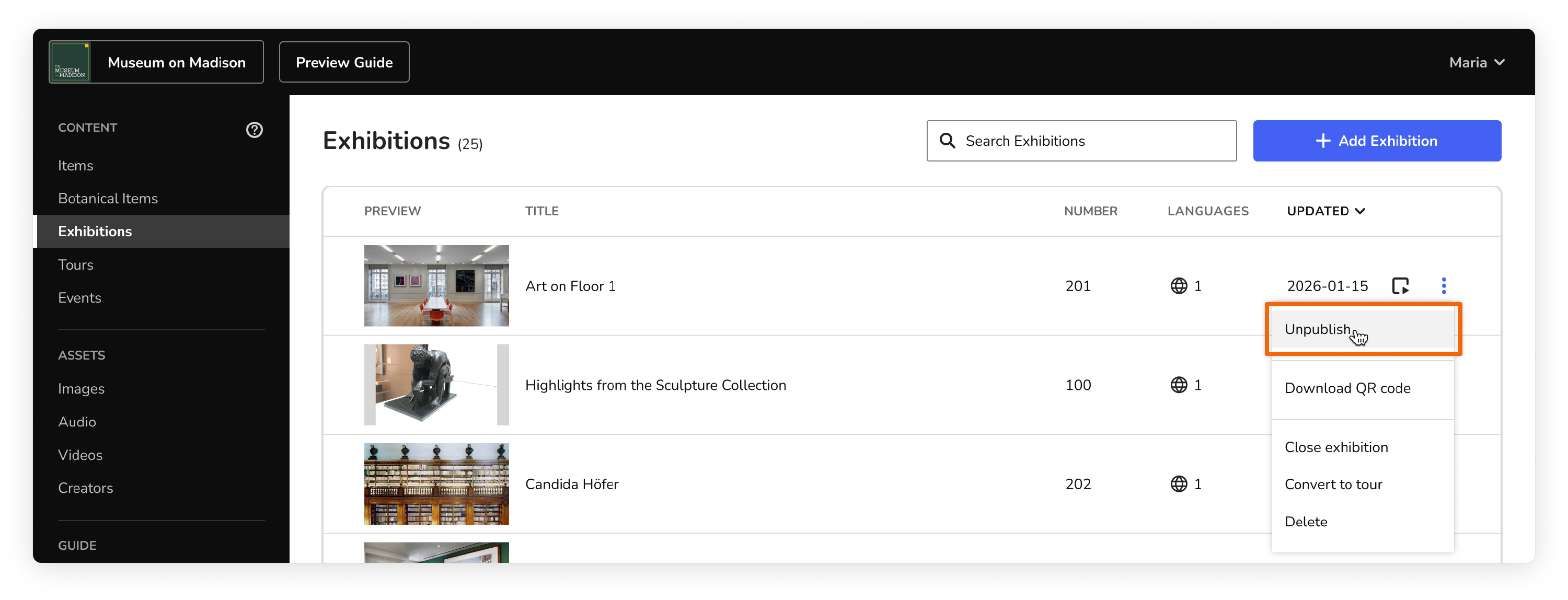 Since all content is independent, you'll see a similar confirmation message when publishing or unpublishing any Exhibition or Tour. For example, you can publish an Exhibition without publishing all of its Items or unpublish a Tour without publishing all of its Items (stops).